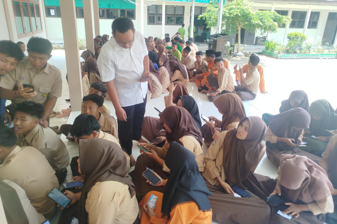 Sungai Gelam (MAN 1 Muaro Jambi) ~Bertempat di pendopo MAN 1 Muaro Jambi, siang tadi (20/09) setelah istirahat pertama para siswa kelas X berkumpul sambil membawa handphone untuk mengikuti simulai ujian. Sumatif tengah semester akan dilaksanaka menggunakan hp. Para siswa diajari cara login menggunakan aplikasi elerning madrasah serta mencari mata pelajaran yang diujikan.