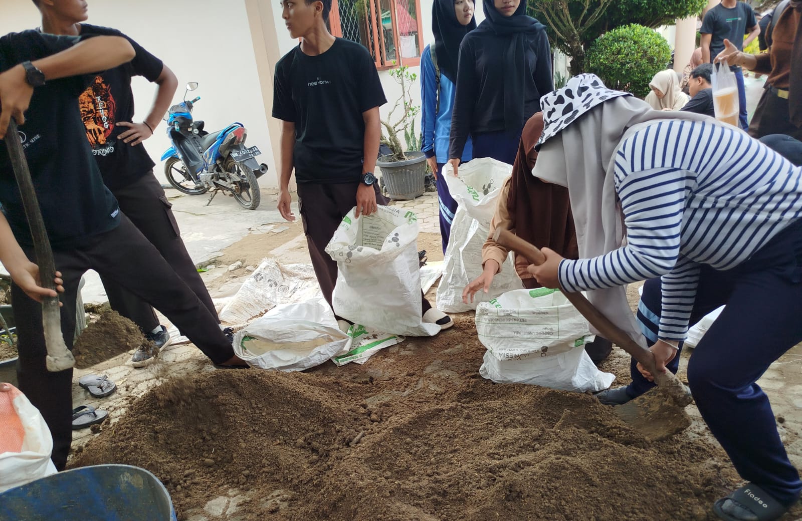 Hari ini kita akan melakukan aksi nyata mulai dari cara pencampuran media tanah dengan kohe (kotoran hewan), memasukkan media tanah ke dalam karung hingga menanam benih . Kiranya tiap kelompok dapat bekerja sama dengan baik", arahan Hj. Nurgayah. Usai pelaksanaan apel pagi dilanjutkan denga aksi nyata para peserta P5. Tiap Kelompok mengambil tanah sesuai kebutuhan.